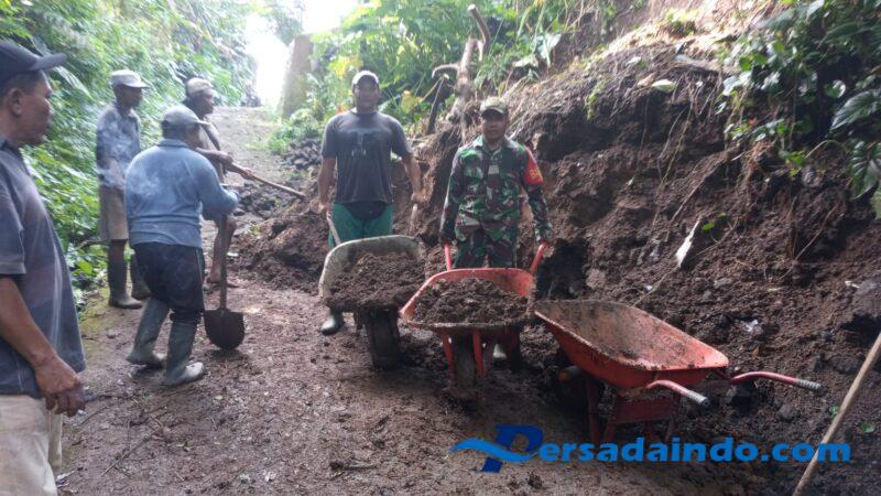 • Gotong Royong Bersama Warga, Babinsa Desa Jegu Bersihkan Longsoran Tanah