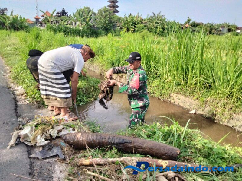 Tampak dalam pantauan, dengan berpakaian dinas Peltu Made Rai tak ragu turun langsung membersihkan sampah-sampah yang menghambat  aliran sungai lobong.
