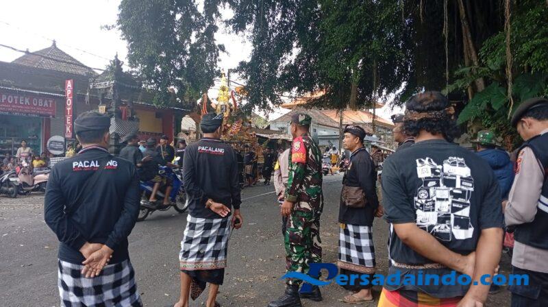 Bangli – Babinsa Desa Undisan Koramil 1626-03/Tembuku, Serda I Wayan Budiarta, bersama Bhabinkamtibmas Polsek Tembuku dan Pecalang Desa Adat Undisan melaksanakan pengamanan rangkaian upacara Ngaben alm. Cokorda Gede Raka Sukawati dan alm Bapak Wayan Yesno, di Banjar Adat Undisan Kelod, Desa Undisan, Kecamatan Tembuku, Kabupaten Bangli, Sabtu (27/9/2025).