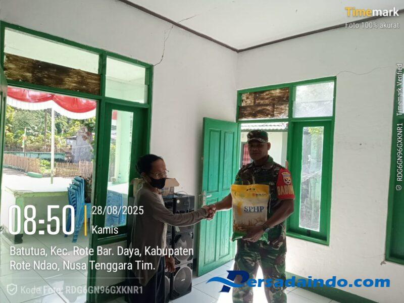 Rote Ndao – Dalam rangka mendukung ketahanan pangan masyarakat dan membantu ketersediaan beras dengan harga terjangkau, Babinsa Koramil 1627-03/Batutua, Praka Nuh Nubatonis, melaksanakan penjualan beras Stabilisasi Pasokan dan Harga Pangan (SPHP) melalui Gerakan Pangan Murah (GPM) bertempat di Desa Sakubatun, Kecamatan Rote Barat Daya, Kabupaten Rote Ndao, Kamis (28/8/2025).
