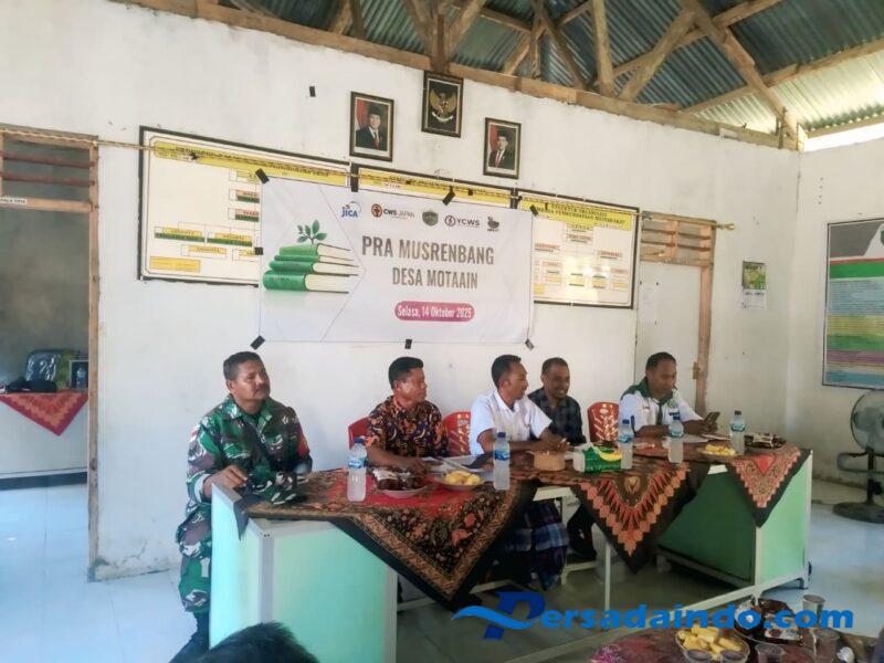 KODIM 1605/BELU, Babinsa Desa Motaain Koramil 1605-09/Biudukfoho Sertu Yohanes Delu menghadiri kegiatan Pra Musrenbangdes Desa Motaain yang berlangsung di Aula Kantor Desa Motaain, Dusun Motaain, Desa Motaain, Kecamatan Malaka Barat, Kabupaten Malaka, Selasa (15/10/2025).