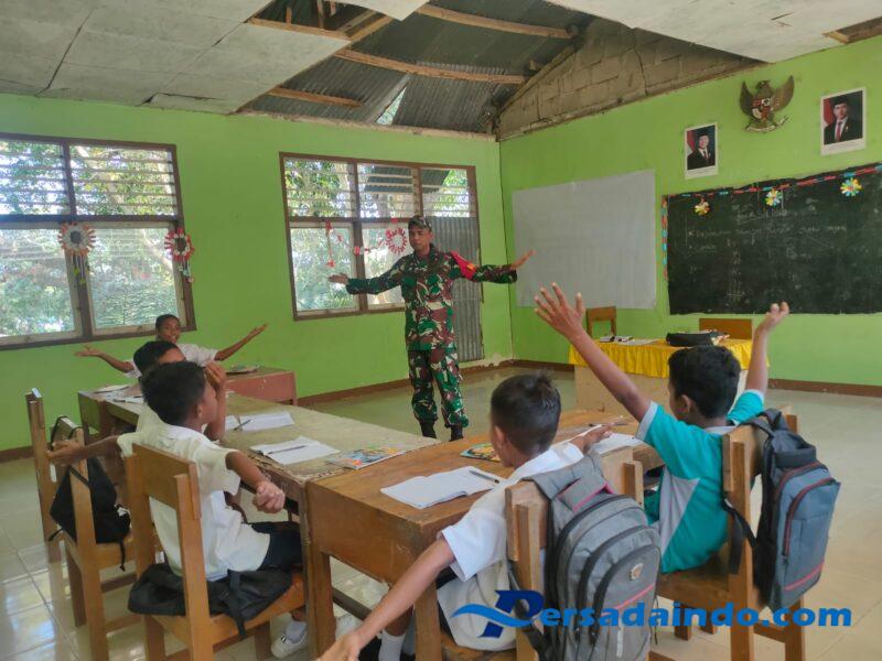 NTT-SIKKA. Serda Dedi Setiabudi melaksanakan kegiatan mengajar Matematika Dasar menggunakan Metode Gasing kepada siswa siswi di SDK Kopong, Dusun Kopong, Desa Kopong, Kecamatan Kewapante, Kabupaten Sikka, Kamis(4/9/2025).