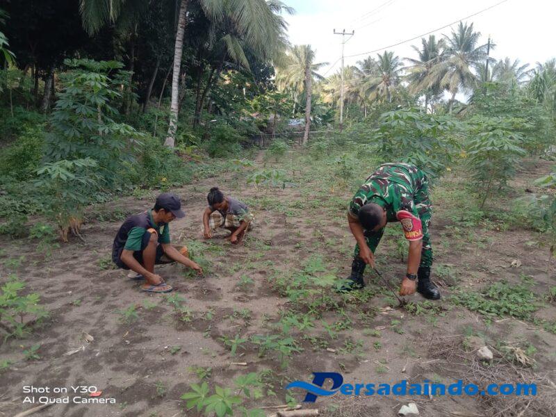 NTT – Ende/Nangapanda, Anggota Koramil 01/Ende Kopda Faisal Indrus melaksanakan pembersihan rumput yang tumbuh di tanaman kacang ijo yag berada di lahan milik Ibu Goreti di Desa Ndorurea 1 Kec. Nangapanda, Kab. Ende, Kamis (26/06/2025).
