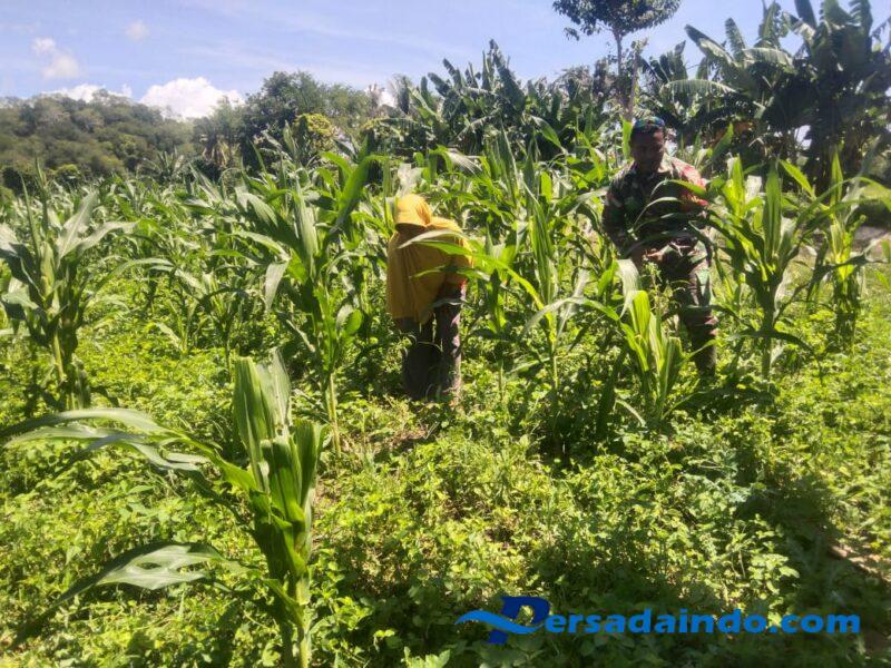 Koptu Mukmin Matoke Babinsa Koramil 05/Waingapu jajaran Kodim 1601/Sumba Timur membantu warga , membersihkan rumput di kebun jagung milik warga binaan di Kelurahan Mauliiru, Kecamatan Kambera, Kabupaten Sumba Timur, Senin (21/04/2025)