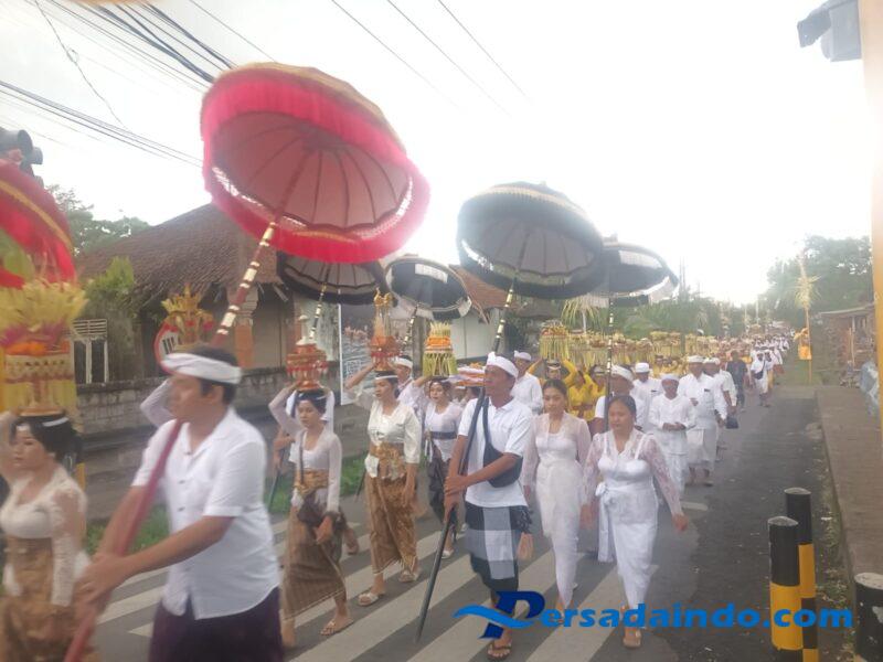 Upacara tersebut menampilkan perpaduan yang indah antara nilai spiritual, adat, dan seni budaya Bali. Tampak para warga mengenakan busana adat yang anggun dan sopan, mengiringi barisan gebogan serta sarana upacara yang penuh warna dan makna simbolik. Nuansa religius berpadu dengan keindahan budaya, menciptakan pemandangan sakral yang menggambarkan kekayaan tradisi Bali yang masih terjaga hingga kini.