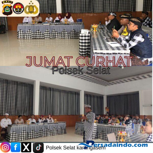 Pada hari Jumat tanggal 27 Juni 2025 sekitar Pukul 08:30 Wita Kapolsek Selat yang di wakili Waka Polsek Selat, Babinkamtibmas Desa Duda Timur di dampingi Personil Polsek Selat melaksanakan giat sambang sekaligus serap keluhan Warga / Tokoh Masyarakat di Desa Duda Timur Kecamatan Selat, yang disinkronkan dengan kegiatan Kepolisian dengan tema “Jumat Curhat”.