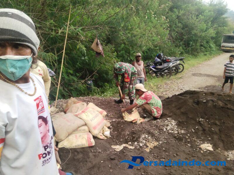 Selain itu, Babinsa juga turut serta dalam karya bakti pengerjaan rabat jalan, menunjukkan kepedulian langsung terhadap kebutuhan warga dan mendukung pembangunan infrastruktur desa.
