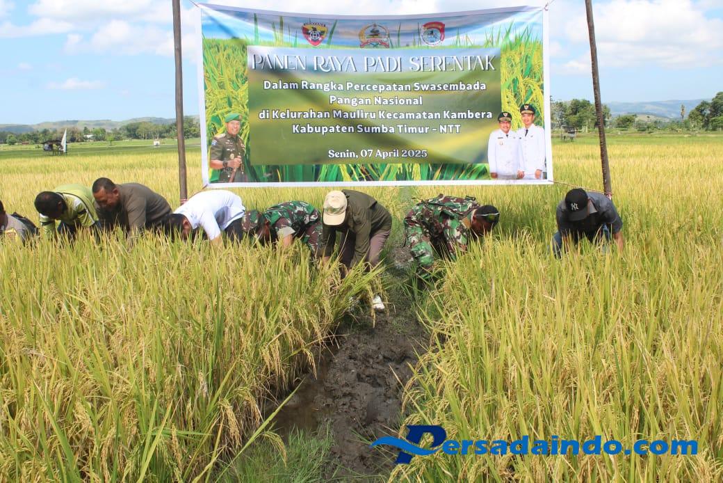 Persadaindo.com -Dalam Rangka meningkatkan ketahanan pangan Kepala Staf Kodim 1601/Sumba Timur Mayor Inf. Sambudi bersama Forkopimda dan Anggota Kodim 1601/Sumba Timur melaksanakan Panen Raya padi serentak di Kelurahan Mauliiru, Kecamatan Kambera, Kabupaten Sumba Timur, Senin (07/04/2025)