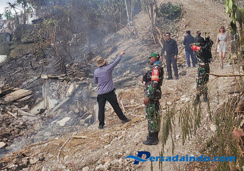 “Babinsa menegaskan perihal peristiwa tersebut, bahwa kebakaran diduga akibat dari sisa-sisa bangunan yang disebabkan oleh percikan dari alat Las para pekerja dalam memotong besi bangunan, dan percikan api tersebut kemudian terpercik ke sisa bongkaran bangunan yang mudah terbakar.” Tegas Serka Almerio Pinto.