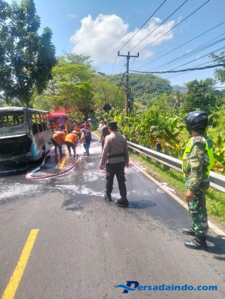 Kebakaran bus tersebut menyebabkan kemacetan lalu lintas, kami bersama anggota Polsek melaksanakan pengaturan lalin sekaligus membantu Damkar melaksanakan pemadaman api, saat ini api sudah bisa dipadamkan dan permasalahan dalam penanganan pihak berwajib, tutupnya.
