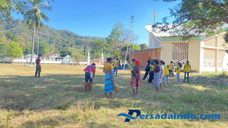 Pos Silawan mewujudkan toleransi antar umat beragama jelang perayaan Hari ulang Tahun Paroki Stelah Maris yang akan di adakan kegiatan prosesi pengarakan patung Bunda Maria, dipimpin langsung oleh Wadanpos Silawan Sertu Tonubes dan anggotanya bersama Mahasiswa KKN dari UGM dan Undana melaksanakan karya bakti pembersihan lingkungan Gereja bersama masyarakat setempat.