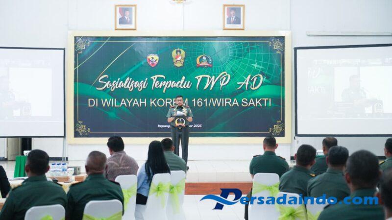 Turut hadir pada kegiatan sosialisasi terpadu TWP AD yaitu; Komandan Korem 161/Wira Sakti, Kolonel CZI Agung Budi Laksono selaku pemateri sosialisasi, para Kasi Kasrem 161/Wira Sakti, Para Dandim Jajaran Korem 161/Wira Sakti yang mengikuti melalui Vicon 20 satuan serta 150 orang peserta Prajurit TNI dan PNS Korem 161/Wira Sakti.(Penrem)