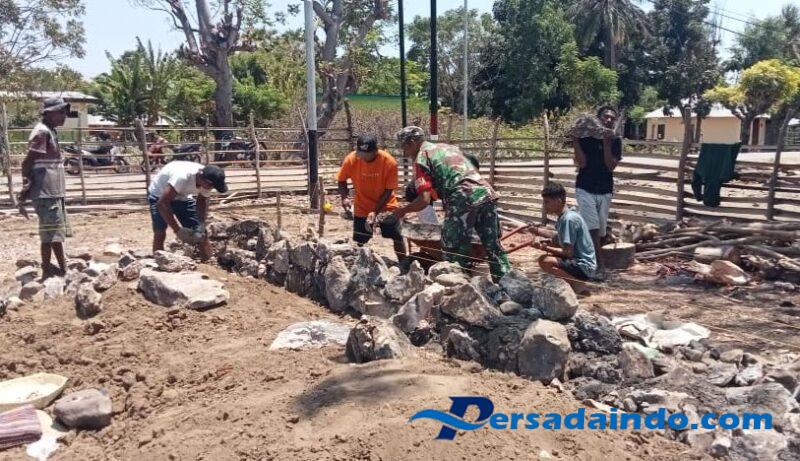 Sertu Albino Leki bersama warga terlihat bekerja bahu-membahu mengangkat batu, merapikan susunan pondasi, hingga memastikan proses pembangunan berjalan sesuai harapan. Suasana gotong royong yang tercipta tidak hanya mempercepat pekerjaan fisik, tetapi juga menjadi wujud nyata kemanunggalan TNI dengan rakyat. Keterlibatan Babinsa membuat warga kian bersemangat karena merasa mendapat dukungan langsung dari aparat teritorial yang selama ini menjadi mitra dekat masyarakat.