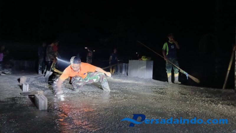 Sejak pagi hingga malam hari, para personel Satgas bersama masyarakat terus bergotong royong menuntaskan pembangunan jalan penghubung antardusun, meski cuaca tak bersahabat.