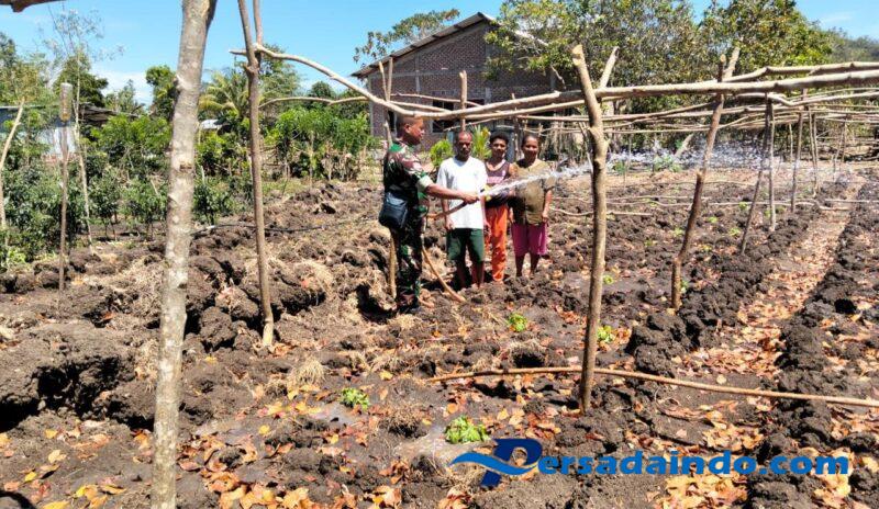 NTT-Kefamenanu, Senin 29 September 2025, Dalam upaya mendukung program ketahanan pangan nasional, Babinsa Koramil 1618-04/Bisel, Serda Benediktus Nainatun, melaksanakan kegiatan monitoring wilayah sekaligus membantu Petani merawat tanaman sayur di lahan milik Bapak Kanis yang terletak di RT 03, RW 01, Desa Tainsala, Kecamatan Insana Tengah, Kabupaten Timor Tengah Utara (TTU).