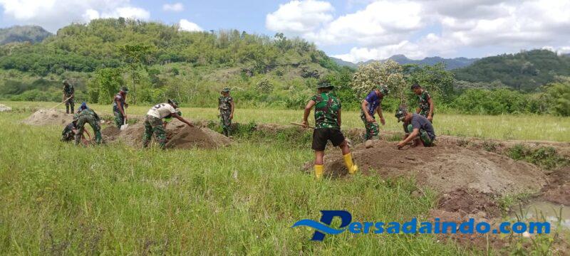 Personel Satgas TMMD bersama masyarakat bahu-membahu mengumpulkan material sebagai tahap penting dalam memperlancar proses pengerjaan saluran. Meski kondisi medan cukup menantang, semangat gotong royong tidak surut, mencerminkan sinergi antara TNI dan warga dalam mendukung peningkatan sarana pertanian desa.