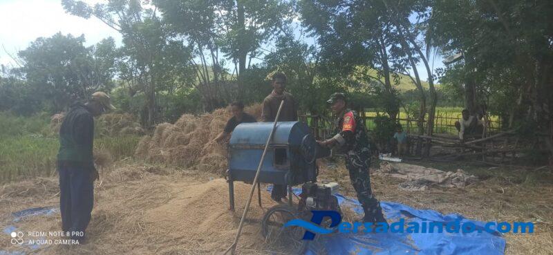 Ende, — Babinsa Koramil 1602-04/Maurole, Serka Densius Berno, ikut serta dalam kegiatan Han Pangan dan perontokan padi sawah bersama Kelompok Tani Tatangga Usaha di Dusun Sokolago, Desa Tou Timur, Kecamatan Kotabaru, Kabupaten Ende, Sabtu pagi (15/11). Kegiatan berlangsung sejak pukul 08.17 WITA hingga selesai, berjalan aman, lancar, dan tertib.