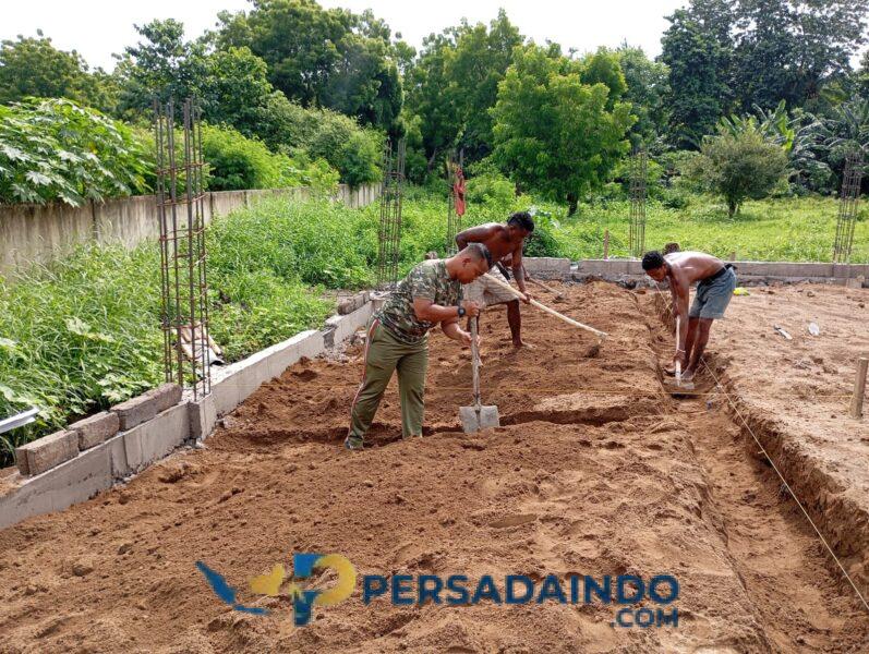 Tidak hanya melakukan pengawasan dan pendampingan, Praka Aris Wijayanta juga terlihat aktif membantu para tukang dalam proses pengerjaan bangunan. Ia turut terlibat langsung di lapangan sebagai wujud nyata kepedulian TNI terhadap kemajuan wilayah binaannya.