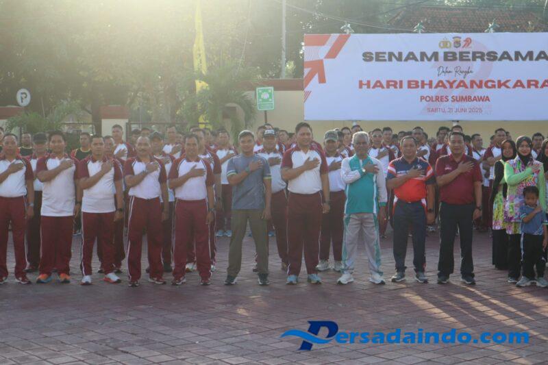 ‎Ntb — Sumbawa Besar, Dandim 1607/sumbawa bersama anggota turut serta ikuti senam bersama memeriahkan hari Bhayangkara ke 79, bertempat dilapangan Wicaksana Lhagawa Polres Sumbawa. Sabtu (21/06/2025).
