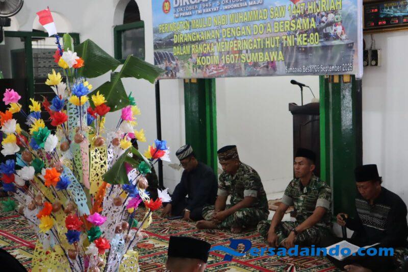 NTB – Sumbawa — Dalam rangka meningkatkan kualitas keimanan dan ketakwaan prajurit sekaligus mempererat silaturahmi, Kodim 1607/Sumbawa menyelenggarakan kegiatan Peringatan Maulid Nabi Muhammad SAW 1447 H yang dirangkaikan dengan doa bersama menyambut HUT TNI ke-80. Kegiatan ini berlangsung khidmat di Musholla Abul Khoir Makodim 1607/Sumbawa, Jumat (26/09/2025).