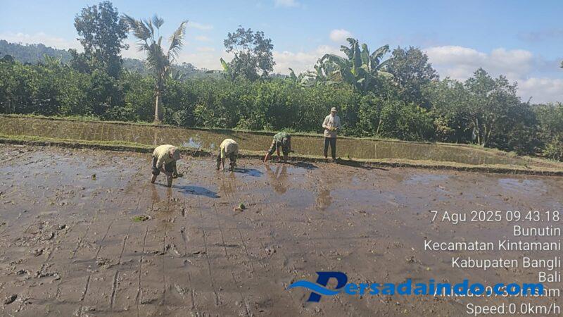 Bangli – Sebagai bentuk nyata dukungan terhadap program ketahanan pangan nasional, Babinsa Desa Bunutin, Serka I Nyoman Lodra, melaksanakan kegiatan pendampingan penanaman padi bersama petani Subak Gunung Mekar Merta Sari, Desa Bunutin, Kecamatan Kintamani, Kabupaten Bangli. Kamis (07/8/25)