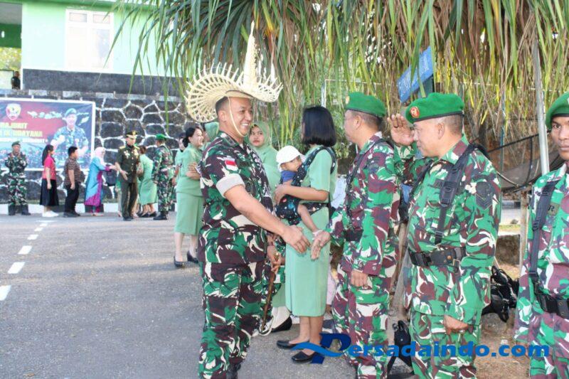 Tradisi dilanjutkan dengan jabat tangan dari seluruh prajurit, disertai lagu penyambutan yang mengalirkan suasana akrab dan harmonis di lingkungan satuan.