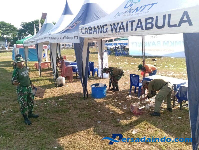 Kegiatan karya bakti dilaksanakan dengan penuh semangat gotong royong. Personel TNI, Polri, Brimob, Pol PP, Pelajar dan masyarakat saling bahu-membahu membersihkan sampah di lapangan Galatama.