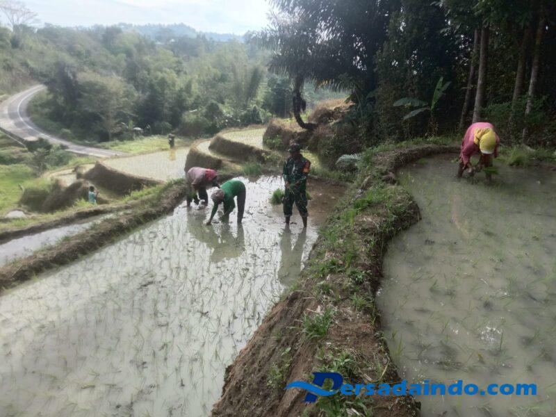 Aksi ini bukan sekadar formalitas; Serda Lalu secara aktif terlibat langsung, mulai dari mencabut bibit hingga menancapkannya satu per satu ke lumpur sawah yang telah disiapkan.