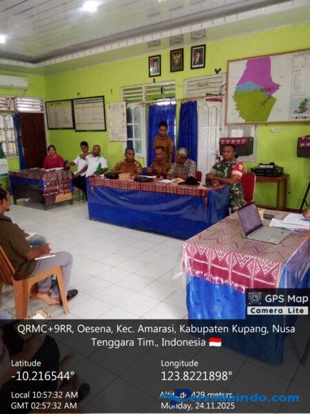 NTT-KUPANG, – Babinsa Oesena Koramil 1604-04/Amarasi, Serda Yornam T. Kase, menghadiri Musyawarah Desa (Musdes) terkait pembahasan penetapan lokasi dan unit kerja Koperasi Merah Putih yang digelar di Aula Kantor Desa Oesena, Kecamatan Amarasi, Kabupaten Kupang. Musyawarah ini turut dihadiri PLT Camat Amarasi Janwar P. Modok, S.E., Kasi Ekonomi Kecamatan Amarasi Yohana Pa, S.E., Kepala Desa Oesena Nelson F. Boymau, Ketua BPD Ismael Rini, pendamping lokal desa, Ketua Koperasi Merah Putih Thobias Masneso, para kepala dusun, tokoh pemuda, serta tokoh masyarakat. Senin (24/11/2025).