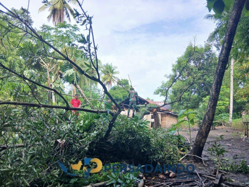 Dalam kegiatan tersebut, Babinsa turut membantu warga membersihkan pohon tumbang yang berada di samping rumah milik Bapak Abdul Kadir. Kehadiran Babinsa disambut baik oleh keluarga pemilik rumah dan pemuda setempat yang bersama-sama melakukan pembersihan ranting dan batang pohon demi menjaga keselamatan lingkungan sekitar.