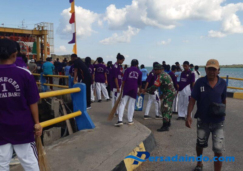NTT Rote Ndao – Dalam upaya mewujudkan masyarakat hidup sehat dengan lingkungan yang bersih, Babinsa Serka Gasper Kilimandu Koramil 02/Pantai Baru Kodim 1627/Rote Ndao bersama siswa SMAN 1 Pantai Baru melaksanakan Karya Bakti (Karbak) membersihkan lingkungan Pelabuhan ASDP Desa Ofalanga Kecamatan Pantai Baru Kabupaten Rote Ndao,Untuk mengurangi dampak penyebaran penyakit.Kamis(21/8/25)