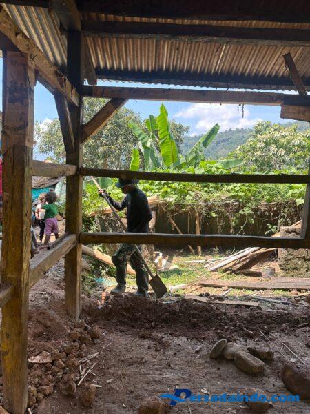 Dipimpin oleh Kopda Muhtar, personel TNI dan warga setempat bahu-membahu. Fokus kegiatan hari ini adalah pembongkaran bagian samping kiri dan kanan rumah warga penerima bantuan. Proses pengerjaan berjalan lancar, didorong oleh semangat kemanunggalan yang tak kenal lelah.