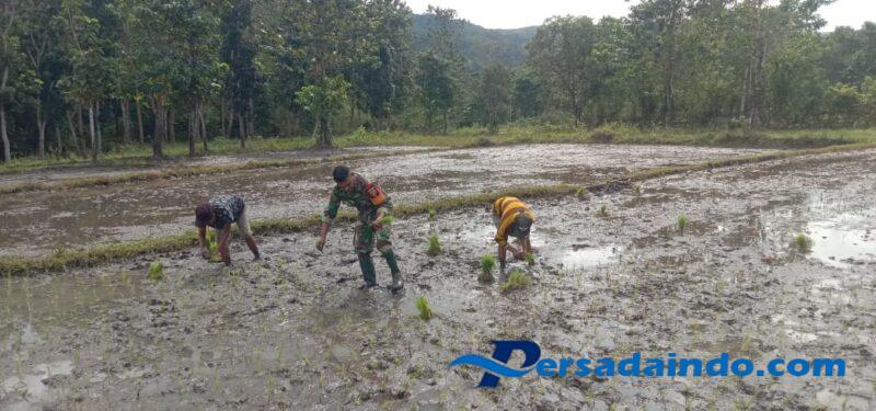 NTT- Sumba Timur, Babinsa Koramil 04/Tabundung jajaran Kodim 1601/Sumba Timur, Kopka Yeni Yupiter Babis mendampingi warga binaan menanam padi dalam mendukung program swasembada pangan milik ibu Rambu di Desa Persiapan Prekomba, Kecamatan Tabundung, Kabupaten Sumba Timur, Senin (21/07/2025)