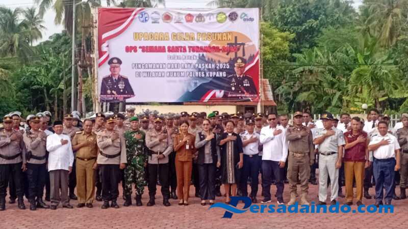 Persadaindo.com – NTT-KUPANG – Untuk menjamin perayaan hari raya Paskah 2025 oleh umat Kristiani dalam suasana aman dan damai, Polres Kupang menggelar Apel Gelar Pasukan Operasi Samana Santa Turangga 2025, bertempat di lapangan Mapolres Kupang, Jln Timor Raya 21, Kelurahan Babau, Kecamatan Kupang Timur, Kabupaten Kupang, Selasa (15/4/2025).