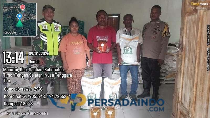 Manufui, TTS — Babinsa Koramil 1621-04/Amanatun Utara Sertu Yosri Tamelan melakukan monitoring langsung kegiatan penyaluran bantuan pangan nasional di Desa Manufui, Kecamatan Santian, Kabupaten Timor Tengah Selatan, Jumat (09/01/2026).