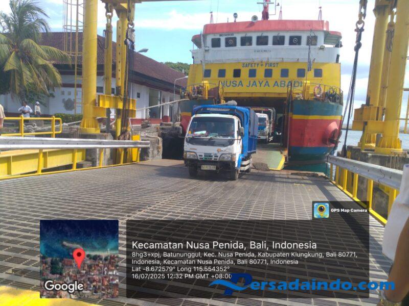 Pendistribusian bantuan pangan beras tersebut digeser ke Kecamatan Nusa Penida dengan menggunakan truck yang diangkut kapal RORO.