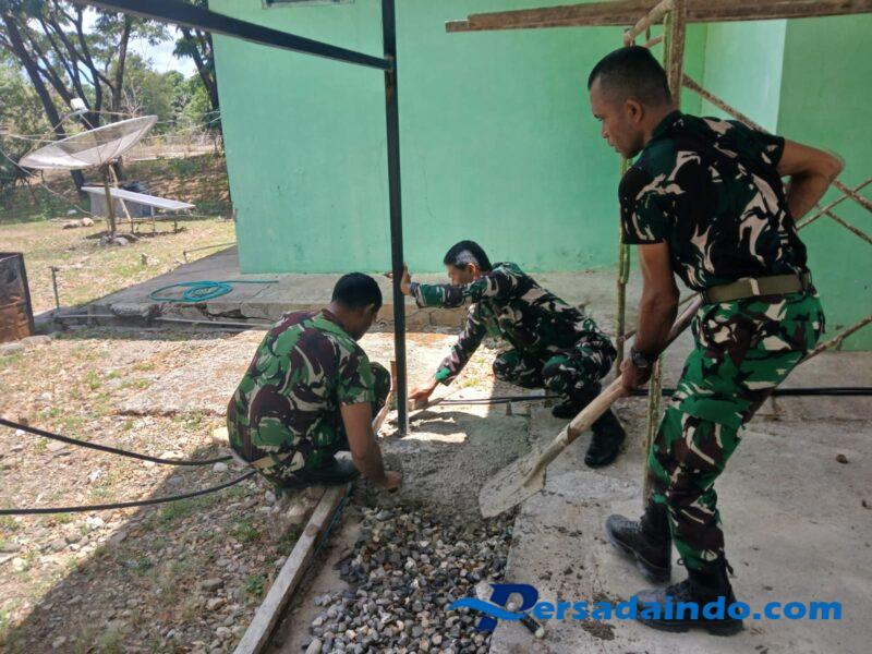 KODIM 1605/BELU, Sejumlah personil Babinsa Koramil 1605-07/Wedomu yang dipimpin langsung oleh Danramil 1605-07/Wedomu Mayor Inf Alex Bessie bergotong royong melaksanakan pengerjaan pembangunan garasi Koramil, Senin (20/10/2025).