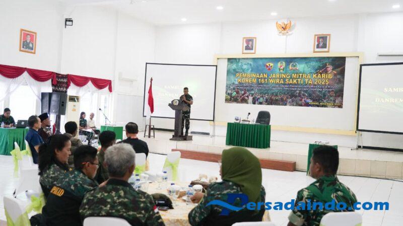 Komandan Korem 161/Wira Sakti Brigjen TNI Hendro Cahyono yang di wakili Kasiter Kasrem 161/Wira Sakti Kolonel Inf Pedro Soares Sarmento mengikuti kegiatan pembinaan jaringan mitra karib Tahun 2025, dalam rangka memperkuat sinergi dan kebersamaan TNI–Rakyat, yang berlangsung di Aula Sudirman Makorem 161/Wira Sakti Jl. W.J Lalamentik Oebufu Kota Kupang, Jumat (05/12/2025).