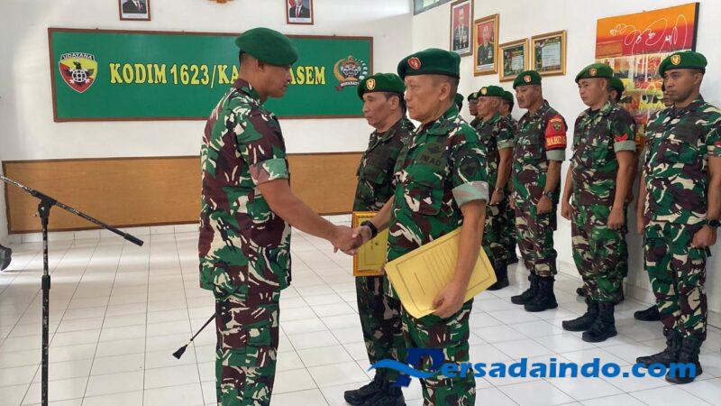 Di tengah kegiatan Korp Raport Dandim 1623/Karangasem memberikan penghargaan kepada Parjurit yang pindah satuan dan melepas 1 orang prajurit yang pindah satuan yaitu Kasdim 1623/Karangasem atas nama Mayor Inf Dewa Putu Oka serta menerima 1 perwira atas nama Lettu Ctp. Djoko Purwo Prasetyo