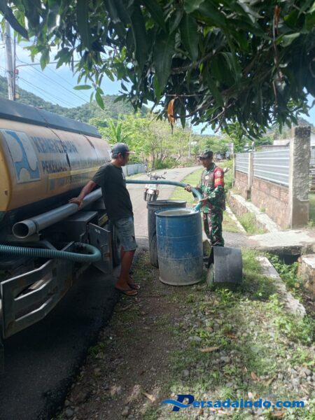 Sejak pagi, Serda Mursaha berada di lokasi untuk memastikan proses pendistribusian berjalan lancar. Ia mengatur antrean, membantu pengisian jerigen dan drum air milik warga, serta memastikan setiap keluarga mendapat bagian sesuai kebutuhan.