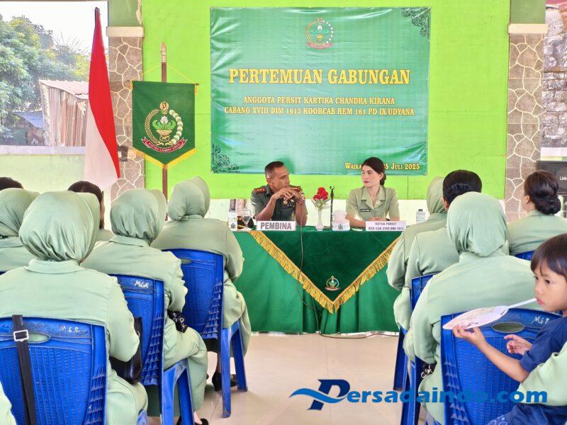 SUMBA BARAT – Komandan Kodim 1613/Sumba Barat, Letkol Inf Ignasius H. Sogen, S.E., M.Han., selaku Pembina Persit Kartika Chandra Kirana Cabang XVIII Dim 1613 Koorcab Rem 161 PD IX/Udayana, memberikan pengarahan kepada seluruh anggota Persit dalam kegiatan pertemuan gabungan yang berlangsung di Aula Makodim 1613/Sumba Barat, Jalan Gajah Mada, Kelurahan Maliti, Kecamatan Kota Waikabubak, Kabupaten Sumba Barat, Jumat (25/7/2025).