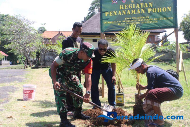 Gianyar – Sukawati, Selasa (12/8/2025) — Memasuki hari ke-20 pelaksanaan TNI Manunggal Membangun Desa (TMMD) ke-125, Satgas TMMD Kodim 1616/Gianyar melaksanakan kegiatan penghijauan dengan menanam 250 pohon berbagai jenis di lahan Desa Adat yang tersebar di wilayah Desa Batuan, Kecamatan Sukawati. Lahan yang digunakan seluas 1 hektare ini ditanami pohon upakara, pohon keras, dan pohon buah sebagai langkah pelestarian lingkungan sekaligus peningkatan potensi ekonomi warga.
