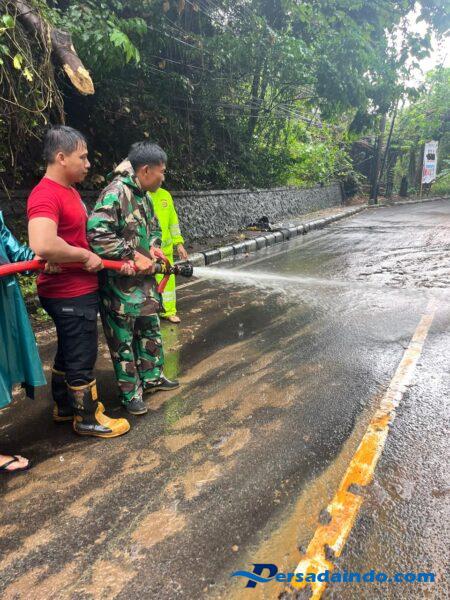 Tampak di lokasi, bersinergi bersama Polsek Banjarangkan dan BPBD Kabupaten Klungkung bahu membahu melaksanakan pembersihan dan evakuasi material longsor yang berserakan menutupi setengah badan jalan yang mengakibatkan arus lalu lintas macet.