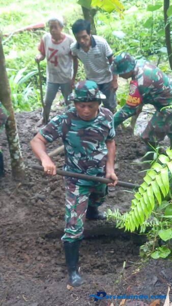 Penanganan material longsor dilaksanakan oleh anggota Koramil 1623-05/Manggis bersama Kadus Banjar Dinas Kaleran serta anggota Tempek Sogsogan Subak Selumbung.