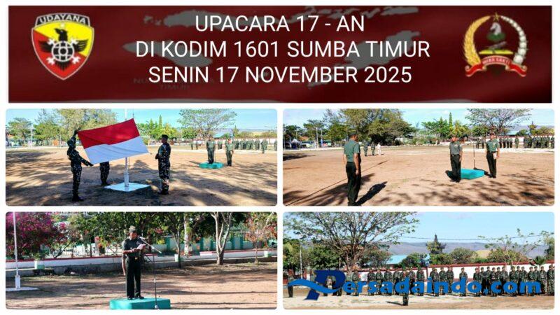 Waingapu, Sumba Timur – Kodim 1601/Sumba Timur melaksanakan Upacara Bendera tanggal 17 setiap bulan sebagai wujud penghormatan kepada jasa para pahlawan dan untuk memperkuat semangat nasionalisme prajurit TNI AD. Upacara berlangsung pada Senin, 17 November 2025, pukul 07.00 WITA, di Lapangan Pahlawan, Jalan Ir. Soekarno, Kelurahan Hambala, Kecamatan Kota Waingapu, Kabupaten Sumba Timur, dengan jumlah peserta sekitar 50 orang.