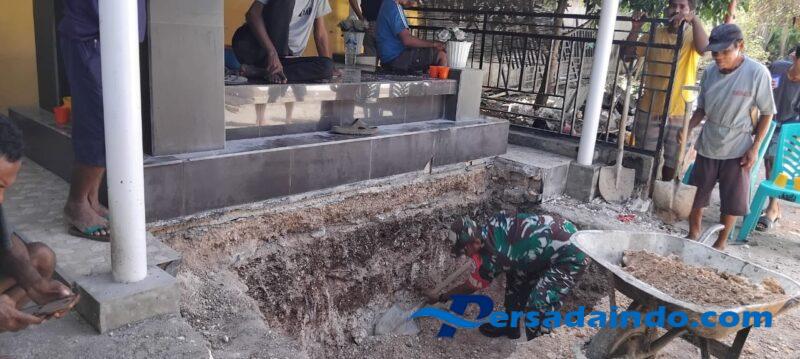 Terlihat Babinsa bersama warga bergotong royong, menggali kuburan untuk memperlancar proses pemakaman jenazah.