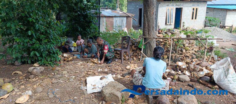 • Mempererat Hubungan TNI Dan Masyarakat Babinsa Membantu Petani Olah kelapa menjadi koprah.