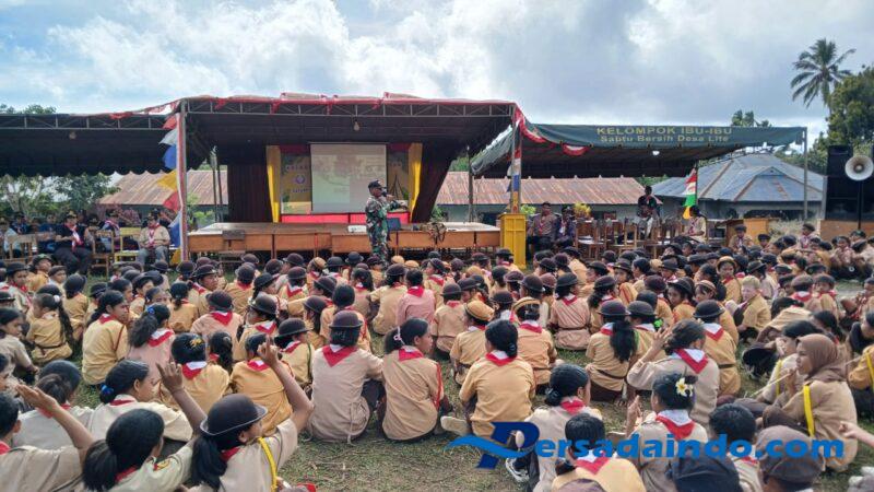 Flotim – Dalam rangka memperingati Hari Pramuka ke-64 yang jatuh pada tanggal 14 Agustus 2025, Danramil 1624-02 Adonara, Kapten Inf Paulus Ibi Weking, bersama Babinsa Kecamatan Adonara Tengah, Pratu Herman Wona, memberikan materi wawasan kebangsaan kepada 497 anggota Pramuka tingkat Gugus Depan Lite 1 yang berlangsung di lokasi perkemahan Pramuka Desa Lite, Kecamatan Adonara Tengah. Rabu, 13 Agustus 2025,