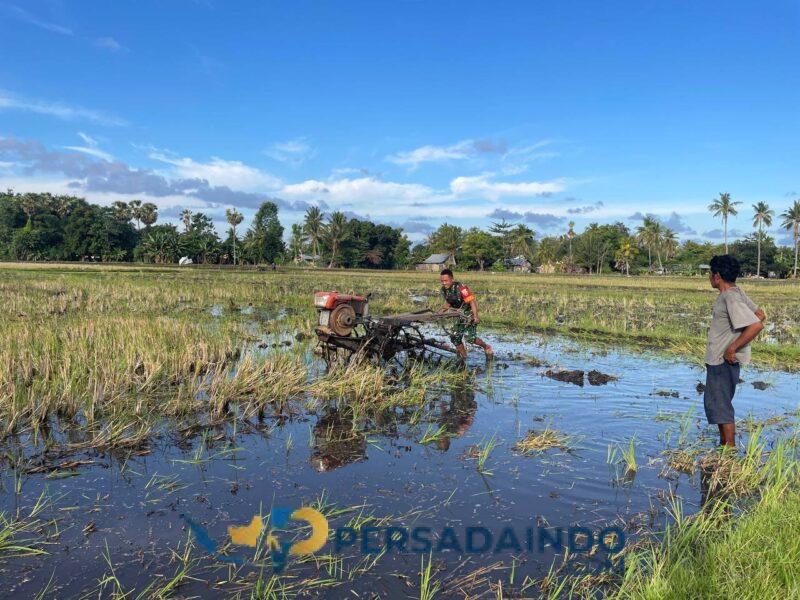 Meski di hari libur, Praka Uus Gusnanda tetap turun langsung ke sawah membantu Bapak Paisal membajak lahan pertanian menggunakan hand traktor yang berlokasi di Kecamatan Rindi, Kabupaten Sumba Timur, pada Minggu (18/01/2026).