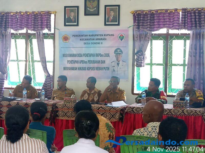 NTT-KUPANG, – Babinsa Oenoni II Koramil 1604-04/Amarasi, Serka Hery Sujibto menghadiri rapat Musyawarah Desa (Musdes) yang diselenggarakan di Kantor Desa Oenoni II, Kecamatan Amarasi, Kabupaten Kupang. Rapat tersebut membahas tiga agenda penting yakni penetapan APBDes Perubahan Tahun Anggaran 2025, penetapan RKPDes Tahun 2025, serta Musdes Khusus Koperasi Desa Merah Putih. Selasa (04/11/2025).